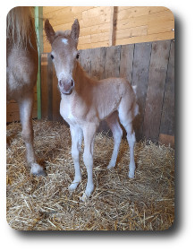 HŘEBEČEK AQH X HF Po 365 dnech březosti konečně vykoukl 1.5.2024 na svět hřebeček jménem Hollywood Merlin po Nelli (Hafling) a Hollywood Buckskin (AQH). Hřebeček je volný k rezervaci